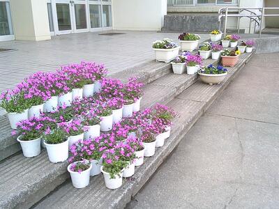 昇降口前には、園芸ボランティアの皆さんが育ててくれたお花、体育館への通路には1年生が育ててくれたお花が並んでいます。きれいに咲き誇り、卒業を祝う準備ができました。