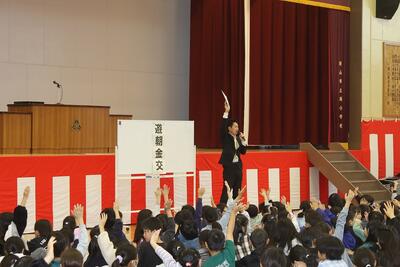 春休みの過ごし方の話では、「遊朝金交」という文字を提示し、それぞれの文字に関する気を付けることを5年児童が全校児童の前で発表し、安全な生活の仕方を確認しました。さすがもうすぐ最高学年になる5年生!